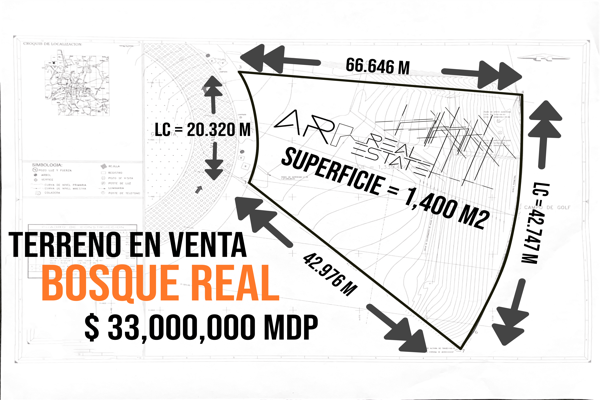 Terreno habitacionalVenta$33,000,000 MXNTerreno disponible en venta en Bosque Real, 52774 Naucalpan de Juárez, Méx., Col. Arenal, Huixquilucan, México, México, C.P. 52774, ID: 30417097 1400 m2 Alberca Mascota Gym