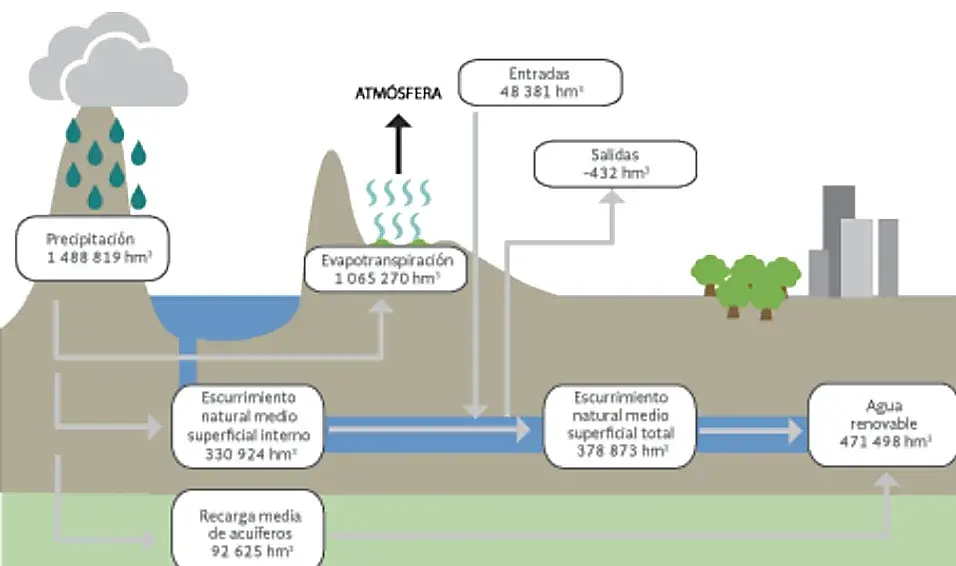 Anualmente México recibe 148,900 millones de m3 en forma de lluvia, nieve y granizo. De esto se evapora el 71.6%, y regresa a la atmósfera el 22.2% a través de ríos o arroyos, el último 6.2% se filtra al subsuelo. México comparte ocho cuencas con los países vecinos: tres con Estados Unidos (Bravo, Colorado y Tijuana), cuatro con Guatemala (Grijalva- Usumacinta, Suchiate, Coatán y Candelaria) y una con Belice y Guatemala (Río Hondo). Si se toman en cuenta estos flujos de salida y entrada de agua, México cuenta con 471.5 mil millones de m3 de agua dulce renovable anualmente.