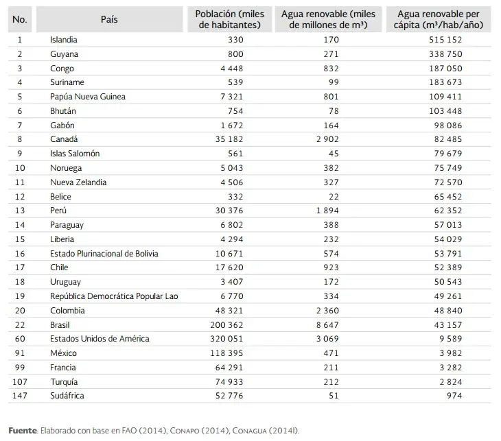 Este cuadro presenta el número de habitantes, el agua renovable y el agua renovable per cápita anual. Las cifras revelan que México, con 118,395 millones de habitantes (hasta 2014), posee 471 mil millones de m3, por lo que corresponden 3,982 m3 per cápita anualmente. Islandia, en cambio, se ubica en la primera posición con 330 mil habitantes, 170 mil millones de m3 y 515,152 m3 per cápita anual. En el último lugar se encuentra Sudáfrica con 52,776 millones de habitantes, tan solo 51 mil millones de m3 de agua renovable, por lo que corresponden 974 m3 per cápita anual.