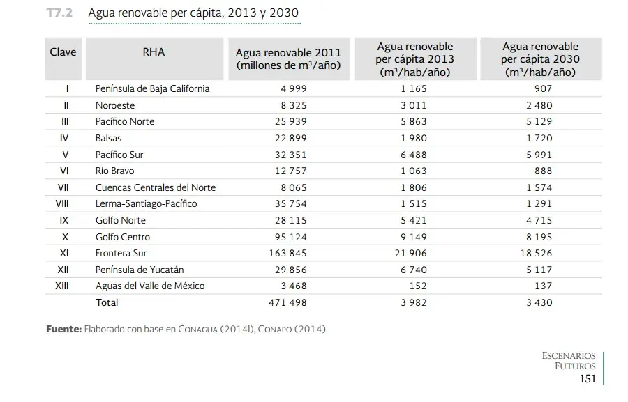 El siguiente cuadro (Conapo, 2014) muestra el estado del agua renovable y la proyección de las RHA a 2030. Los niveles serán cercanos o inferiores a los 1,000 m3 per cápita anuales. Estos niveles solo apuntan a un hecho: la escasez. Las regiones más afectadas serán la RHA de la Península de Baja California, Río Bravo y Aguas del Valle de México.