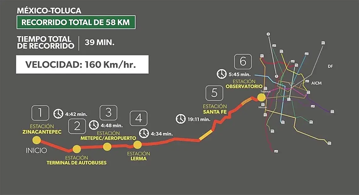 - Reducción del tiempo de traslado: El tiempo total del recorrido de 57.7 kilómetros será de 39 minutos (a diferencia de los 90 minutos del recorrido actual), alcanzará 160km/hr.