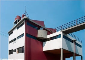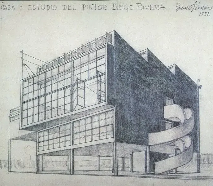 La casa Diego Rivera y Frida Kahlo, una de las primeras construcciones de estilo funcionalista en América Latina, fue edificada en 1931 por el arquitecto Juan O’Gorman, entonces de 26 años. Rivera solicitó a O’Gorman un estudio que no fuera pretencioso y que le recordara sus raíces obreras; un espacio impecable, de trazos sencillos, dimensiones generosas y con acceso a la luz natural.