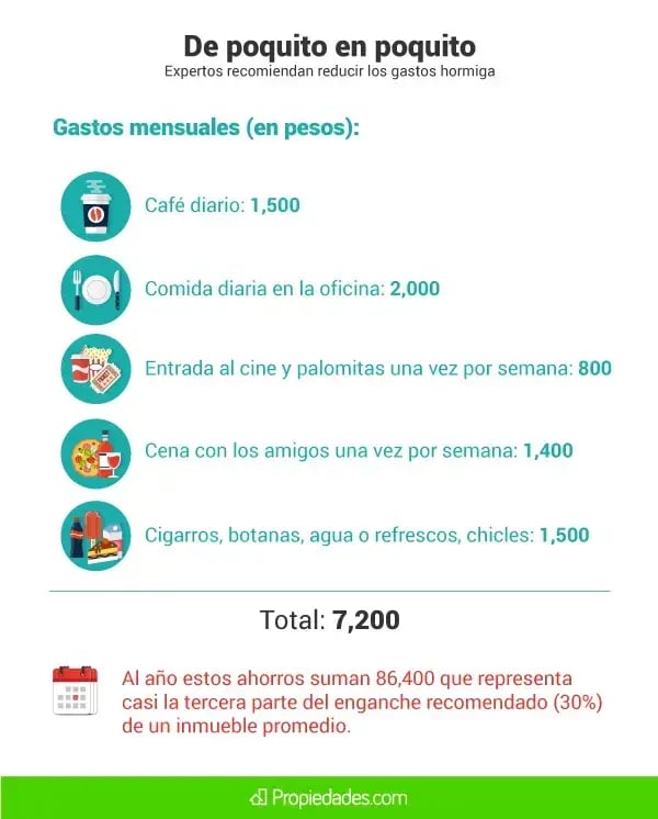 En ocasiones se pueden prescindir de vacaciones o de gastos elevados para incrementar el ahorro, sin embargo, con reducir el consumo cotidiano, los ahorros pueden ser muy significativos.De acuerdo con un cálculo estimado por Propiedades.com, los gastos hormiga pueden alcanzar hasta 7,200 pesos al mes, entre café, comida corrida, gastos en diversión y tienditas.
