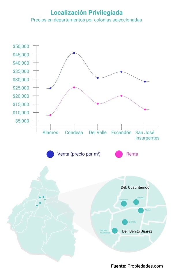 Mientras que la más costosa es Condesa, con 25,000 pesos al mes, y 45,975 por metro cuadrado.