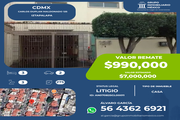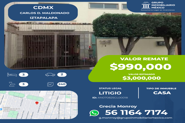 CasaVentaREMATE$990,000 MXNCasa en venta disponible en Carlos Duplan Maldonado, Colonial Iztapalapa, Ciudad de México, CDMX, Col. Colonial Iztapalapa, Iztapalapa, DF / CDMX, México, C.P. 09270, ID: 30805089 3 Recámaras 3 Baños 240 m2