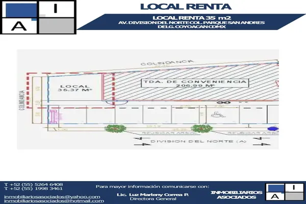 LocalRenta$193,500 MXNLocal en renta disponible en Av. División del Norte #3347, Col. Xotepingo, Coyoacán, DF / CDMX, México, C.P. 04610, ID: 26449496 900 m2 25 Estacionamientos Vigilancia