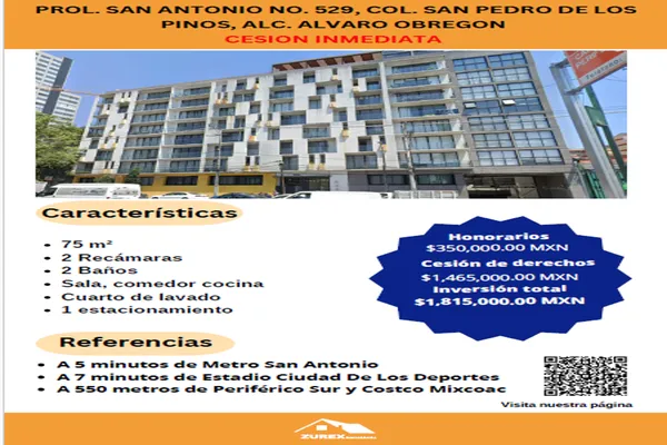 DepartamentoVenta$1,815,000 MXNSe vende departamento en PROLONGACIÓN SAN ANTONIO #529, Col. San Pedro de los Pinos, Álvaro Obregón, DF / CDMX, México, C.P. 01180, ID: 29372266 2 Recámaras 2 Baños 75 m2 1 Estacionamiento Mascota Terraza...