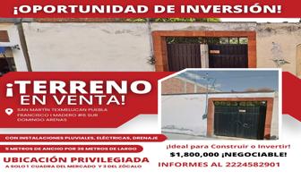 Terreno comercialVenta$1,800,000 MXNTerreno comercial en venta disponible en Francisco I Madero #6 sur, Col. Domingo Arenas, San Martín Texmelucan, Puebla, México, C.P. 74050, ID: 30115010 180 m2