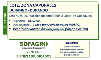 Terreno comercialVenta$5,089,000 MXNSe vende terreno comercial en LOTE Num 99 Int. -, Col. Labor de Guadalupe, Durango, Durango, México, C.P. 34303, ID: 30363317 130000 m2
