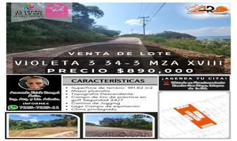 Terreno habitacionalVenta$890,000 MXNTerreno disponible en venta en Lote Violeta 34 - 11 Mza Xviii Fracc Rancho San Diego Ixtapa #11, Col. El Salitre, Ixtapan de la Sal, México, México, C.P. 51924, ID: 27455819 370 m2 Teléfono