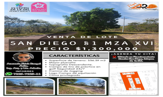 Terreno habitacionalVenta$1,300,000 MXNVenta de terreno en Lote San Diego 98 Mz Xvi Fracc Rancho San Diego Ixtapan Sal #98 XVI, Col. El Salitre, Ixtapan de la Sal, México, México, C.P. 51924, ID: 27452804 581 m2 Teléfono