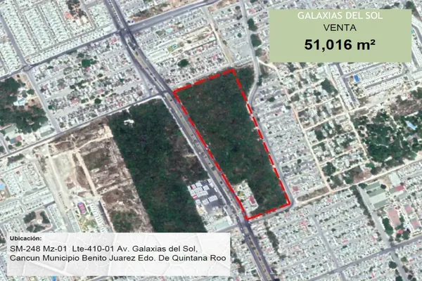 Terreno comercialVenta$102,032,000 MXNTerreno comercial disponible en venta en AV. GALAXIAS DEL SOL #321, Col. Galaxia del Sol, Benito Juárez, Quintana Roo, México, C.P. 77518, ID: 30953527 51016 m2