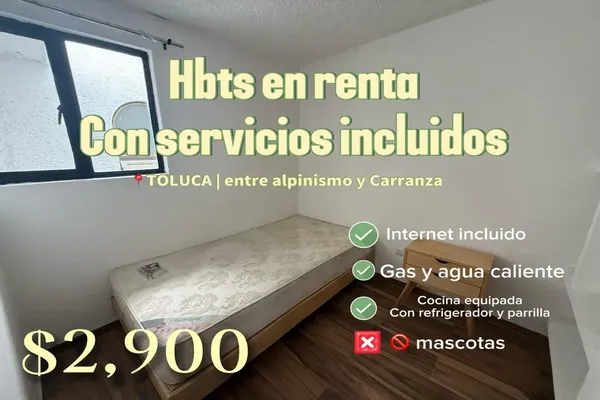 DepartamentoRenta$8,500 MXNBlvr. José María Pino Suárez, Col. Niños Héroes, Toluca, México, México, C.P. 50100, ID: 31046294 2 Recámaras 1 Baño 65 m2 Amueblado C. servicio
