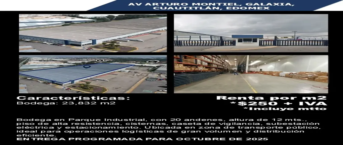 Nocnok id: nn-st1000215. características: bodega: 23,832 m2 bodega en parque industrial, con 20 andenes, altura de 12 mts., piso de alta resistencia, cisternas, caseta de vigilancia, subestación elé...
