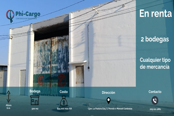 Renta de dos bodegas para cualquier tipo de mercancía. medidas: 500 m2 2 bodegas alto: 6 mtrs aprox. ubicación: google/maps?q=19,-96&z=17&hl=es para más información llamar al