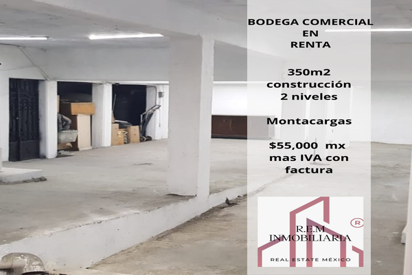 Renta de bodega comercial: 350m2 aproximados, montacargas, dos oficinas, un baño, distribuida en 2 niveles: altura primer nivel 3, altura de sótano 2 excelente ubicación a espaldas de gran sur...