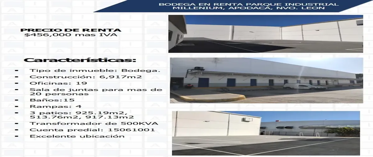 Nocnok id: nn-gwv049. características: tipo de inmueble: bodega. construcción: 6,917m2 oficinas: 19 sala de juntas para mas de 20 personas baños:15 rampas: 4 3 patios: 925, 513, 917 ...