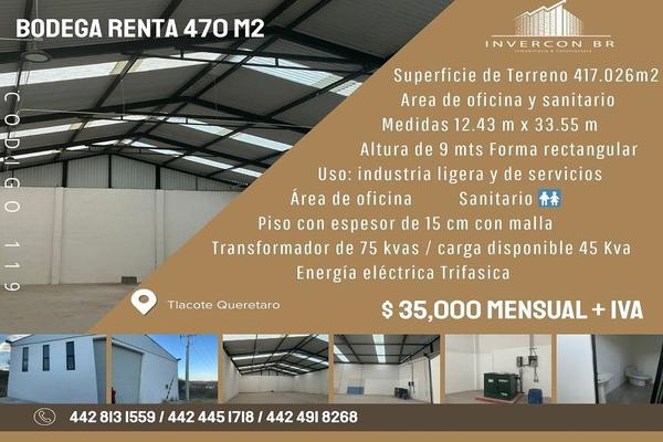 C 119 bodega renta 470 m2 tlacote superficie de terreno 417 bodega: 470m2 (con área de oficina y sanitario). medidas 12 m x 33 m altura de 9 mts forma rectangular uso: industria ligera y d...