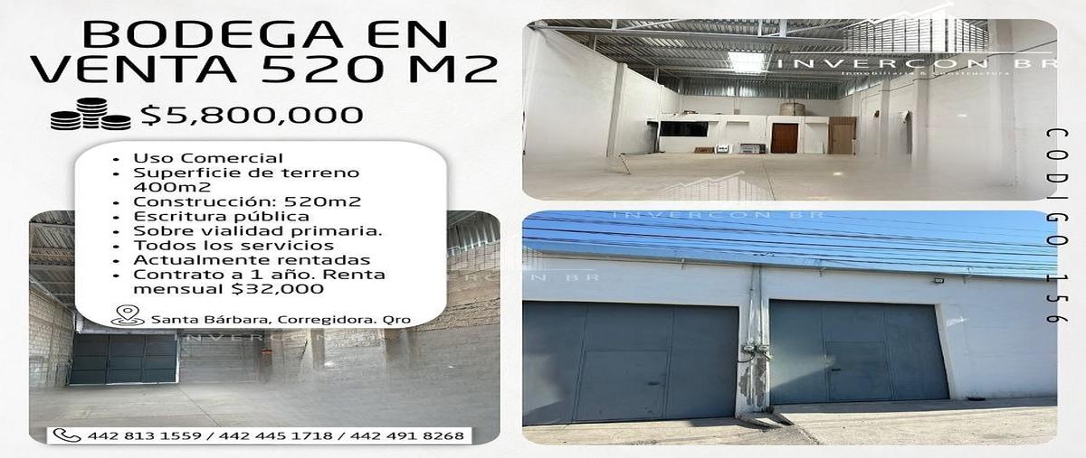 C 156 inversion industrial bodega rentada en venta de 520 m corregidora uso comercial superficie de terreno 400m2 construcción: 520m2 escritura pública sobre vialidad primaria. todos los servicios act...