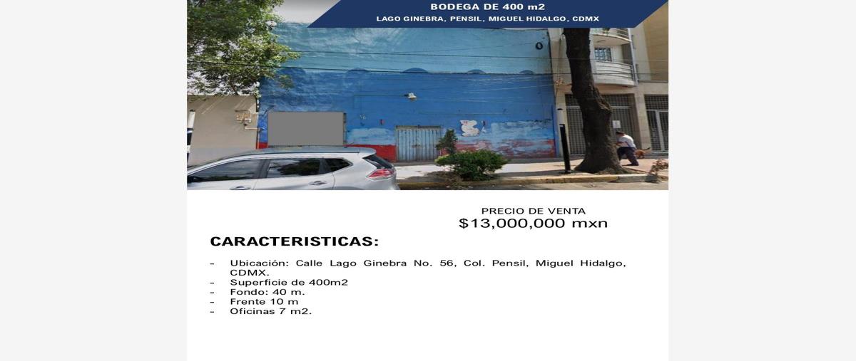 Nocnok id: mx23-ow5587. caracteristicas - ubicacion: calle lago ginebra 56 col. pensil miguel hidalgo cdmx - superficie de 400 m2 - fondo 40 m - frente 10 m - oficinas 7 m2 contáctanos: oficina: (55) ...