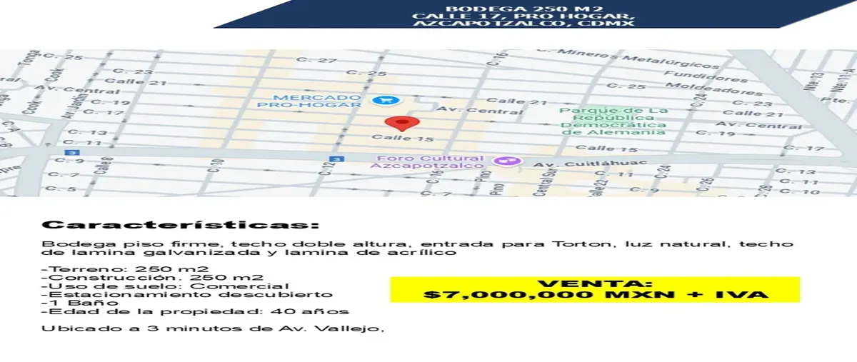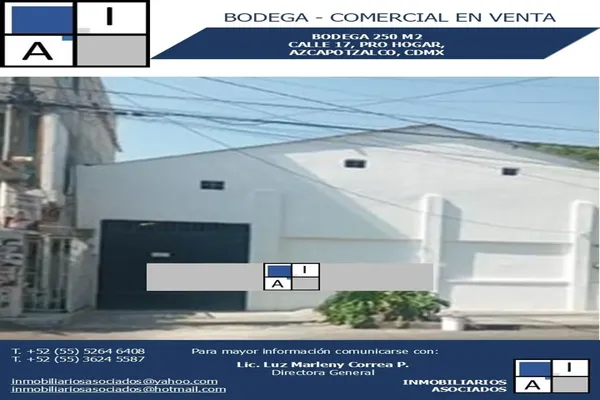 Nocnok id: nn-st1000202. bodega en venta 250 m2, calle 17, pro hogar, azcapotzalco, cdmx características: bodega piso firme, techo doble altura, entrada para torton, luz natural, techo de lamina gal...