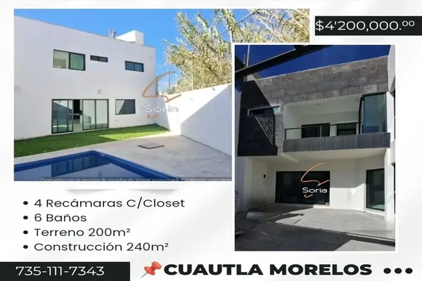 Nocnok id: nn-gqn522. casa en cuautla morelos con albreca ubicada en una privada de solo 5 casas 4 recamaras con baño y closets 6 baños cocina con barra en granito sala comedor jardin alberca ga...