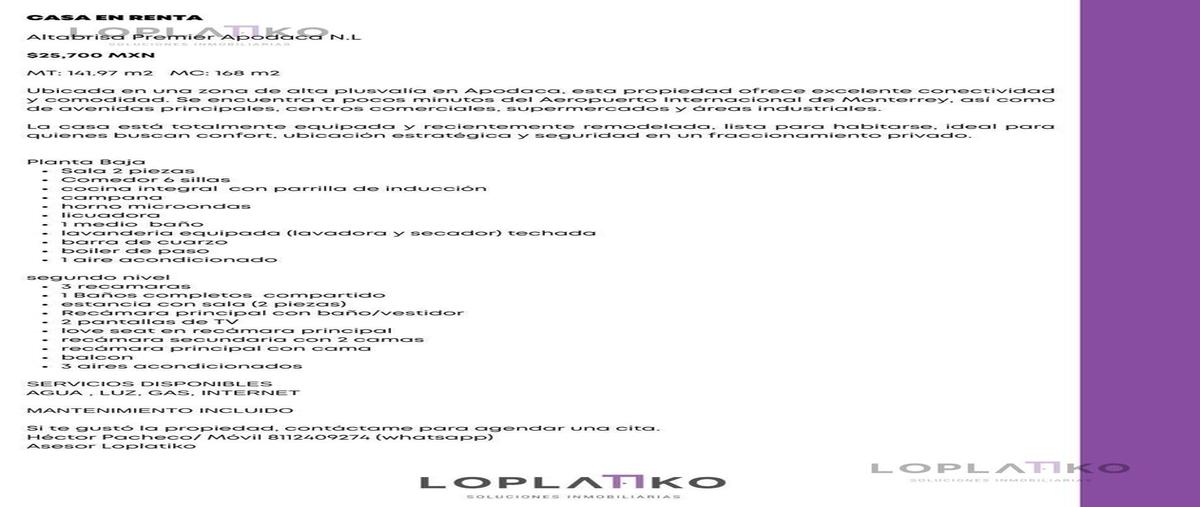 Casa en rentaaltabrisa premier apodaca n$25,700 mxnmt: 141 m2 mc: 168 m2ubicada en una zona de alta plusvalía en apodaca, esta propiedad ofrece excelente conectividad y comodidad. se encuentra a ...