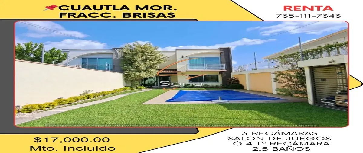 Nocnok id: nn-gxe175. casa en renta brisas de cuautla morelos 3 recámaras salon de juegos o 4ta recamara sala cocina equipada comedor cuarto de lavado jardín alberca garages para 2 autos $1...