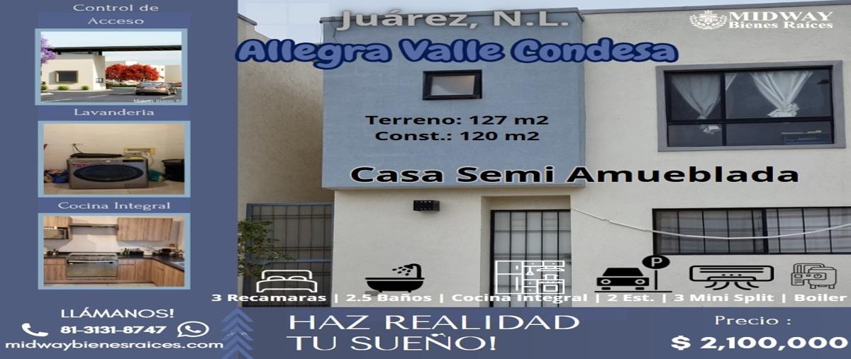 Allegra valle condesa juárez, n. semi amueblada en juárez nl terreno 127 mts construcción 120 mts casa 2 niveles fraccionamiento privado control de acceso 24/7 cuota mensual de mtto. $ 360...