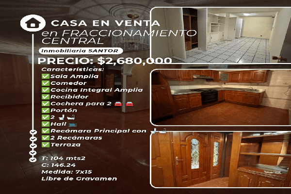 Se vende casa en fracc. central 2 secc. a una cuadra de rutilo torres características: sala amplia comedor cocina integral amplia recibidor cochera para 2 portón 2 hall recámara pr...