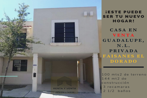 Venta de casa en colonia privada faisanes el dorado en guadalupe n. salida cercana a morones prieto, av. israel cavazos, constitución. terreno: 100 mts2 construcción: 144 mts2 primera planta: -coche...