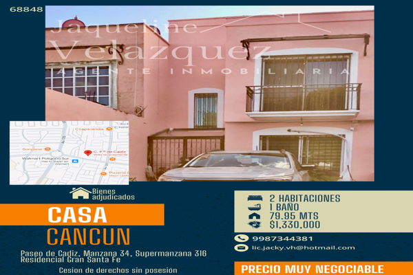 CasaVentaREMATE$1,300,000 MXNC. P.º de Leon, 77535 Cancún, Q.R. #18, Col. Vitalá, Benito Juárez, Quintana Roo, México, C.P. 77535, ID: 30908330 2 Recámaras 1.5 Baños 93 m2