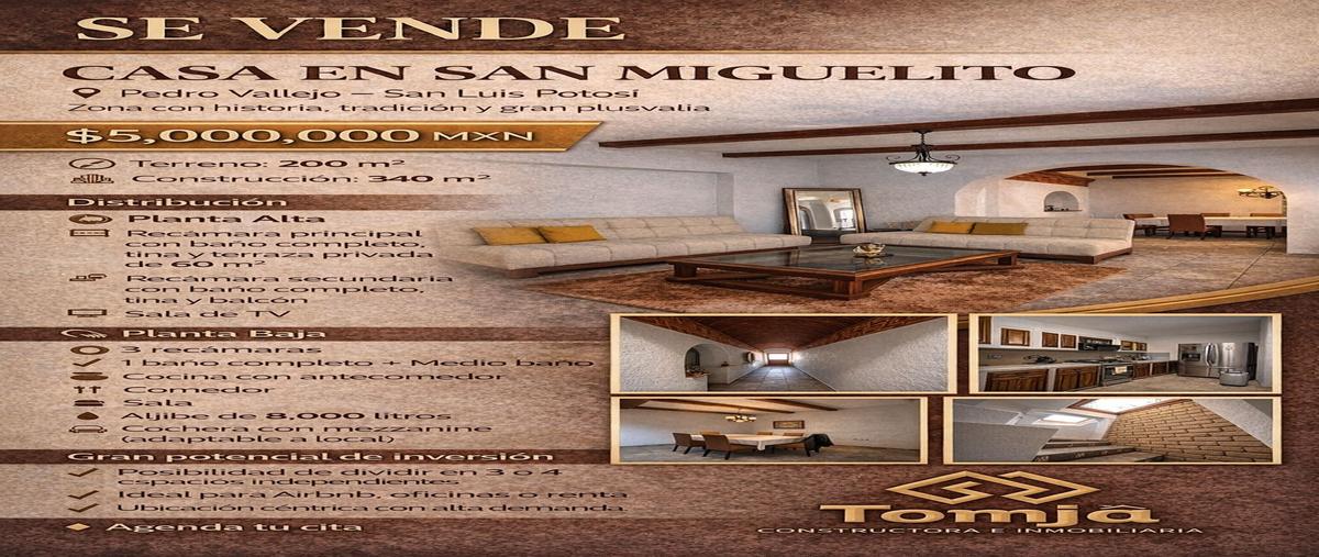 ?✨ casa en venta – barrio de san miguelito, slp ? pedro vallejo · zona céntrica con gran tradición y plusvalía ? precio: $5,000,000 mxn ? terreno: 200 m² ?️ construcción: 340 m² ? planta alta ?️ re...
