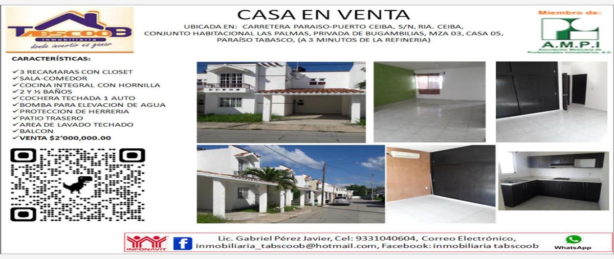 Nocnok id: mx23-pr3854. casa en venta ubicada en: carretera paraiso-puerto ceiba, s/n, ria. ceiba, conjunto habitacional las palmas, privada de bugambilias, mza 03, casa 05, paraíso tabasco, (a 3 mi...