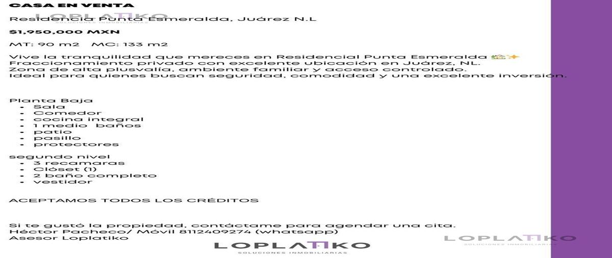 Residencial punta esmeralda, juárez n$1,950,000 mxnmt: 90 m2 mc: 133 m2vive la tranquilidad que mereces en residencial punta esmeralda ?????fraccionamiento privado con excelente ubicación en juárez,...