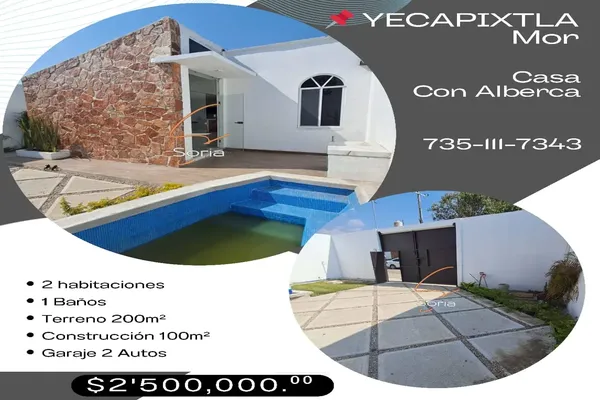 Nocnok id: nn-ff1000208. casa en venta o renta con alberca en yecapixtla...!!! ⛱? ? excelente ubicación en la entrada de yecapixtla descripción: terreno: 200 mts2 construcción: 100 mts2 ? dos re...