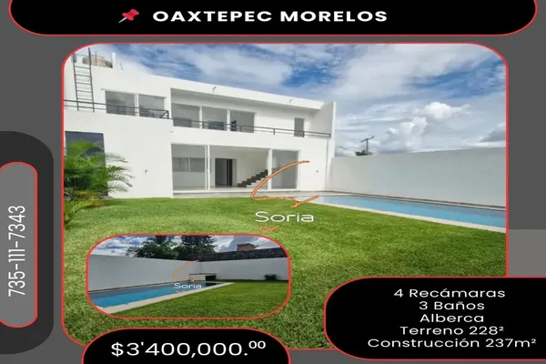 Nocnok id: nn-gst263. casa en oaxtepec morelos ?excelente ubicacion vistas panoramicas ▪️4 recamaras ▪️3 baños ▪️cocina ▪️sala ▪️comedor ▪️jardin ▪️alberca precio $3,400,000 cv-ro real...