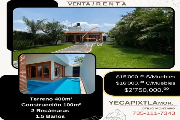 Nocnok id: nn-gwh096. renta o venta casa sola ubicada en la capital mundial de la cecina yecapixtla mor t-400 mts c-100 mts renta $16,000 amueblada renta $15,000 sin muebles venta $2,75...