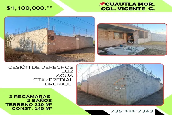 Nocnok id: nn-ff1000571. casa en cuautla morelos cesion de derechos en obra gris 3 recamaras 2 baños cuenta con luz agua drenaje cisterna 10 mil lts cta / predial terreno 210 construccion145 n...
