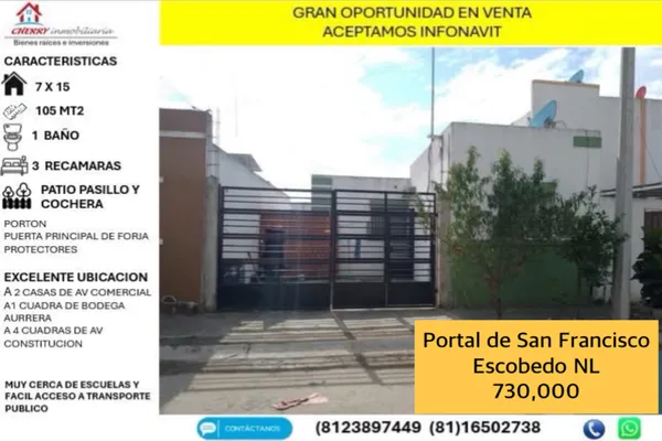 Nocnok id: mx25-kk10093. !!excelente oportunidad en venta!! portal de san francisco escobedo nl gran terreno 7x15 105 mts2 propiedad totalmente individual sobre zona comercial 3 recamaras 1 baño p...
