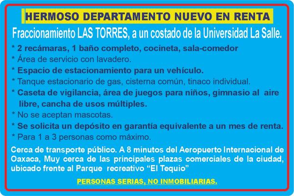 Hermoso departamento nuevo en renta fraccionamiento las torres, a un costado de la universidad la salle. • 2 recámaras, 1 baño completo, cocineta, sala-comedor • área de servicio con lavadero • espa...