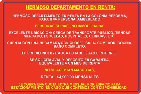Hermoso departamento en renta en la colonia reforma, para una persona, amueblado personas serias , no inmobiliarias excelente ubicacion: cerca de transporte publico, tiendas, mercado, escuelas, hos...