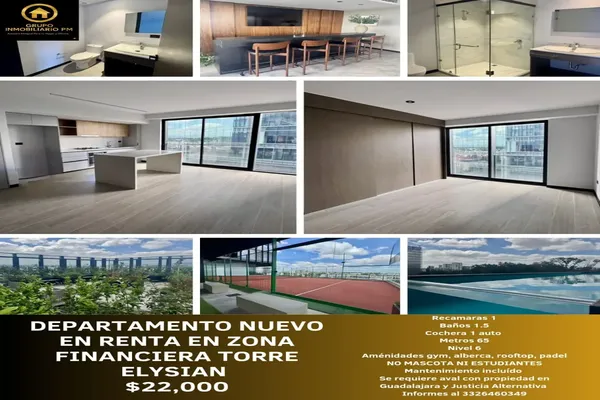 Nocnok id: nn-gwh137. recamaras 1 baños 1 cochera 1 auto metros 65 nivel 6 aménidades gym, alberca, rooftop, padel no mascota ni estudiantes mantenimiento incluído se requiere aval con propiedad e...