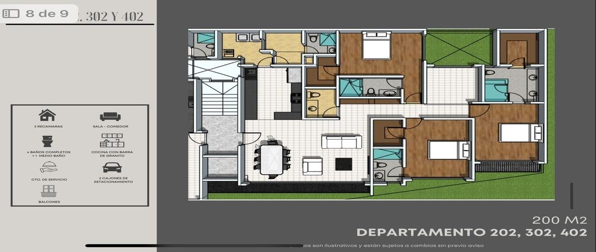 Desarrollo con 7 deptos todos tienen 3 habitaciones con baño y medio baño. roof garden 2 estacionamientos los tamaños varían de 140 a 198 m2 habitables y los precios van de 8,647,600 pesos a 10,732,80...