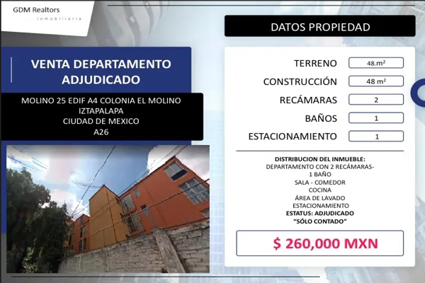 Venta departamento adjudicado localizado en c. el molino 25, la planta, iztapalapa, 09960 ciudad de méxico, cdmx num. ext. 25 num. int. 25 colonia la planta c. 09960, df / cdmx, cuenta con 1 baño, 4...