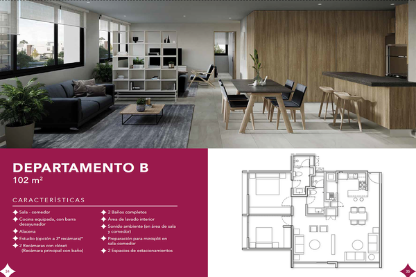 Departamento modelo "b" con 102 m2 de superficie. sala comedor. cocina equipada con barra desayunador. alacena. estucio (opción a 3a. recámara. 2 recámaras con clóset (recámara principal con baño comp...