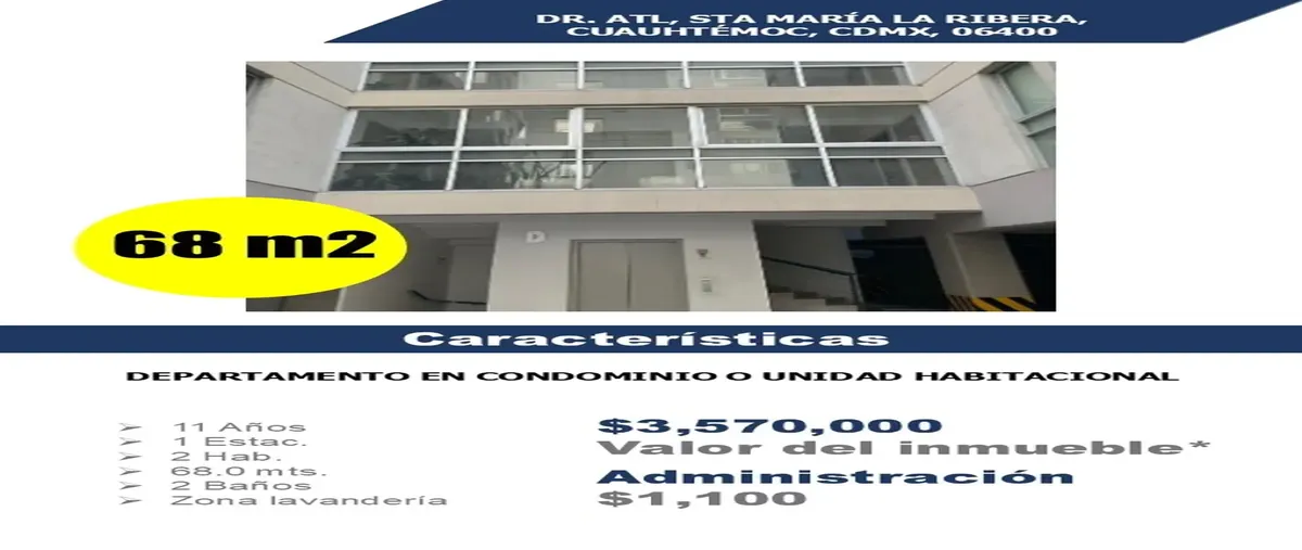 Nocnok id: nn-st1000326. depto en venta 68m2, dr atl, sta ma la ribera. cuauhtem0c, cdmx departamento en condominio o unidad habitacional ➢ 11 años ➢ 1 estac. ➢ 2 hab. ➢ 68 mts. ➢ 2 baños ➢ zona l...