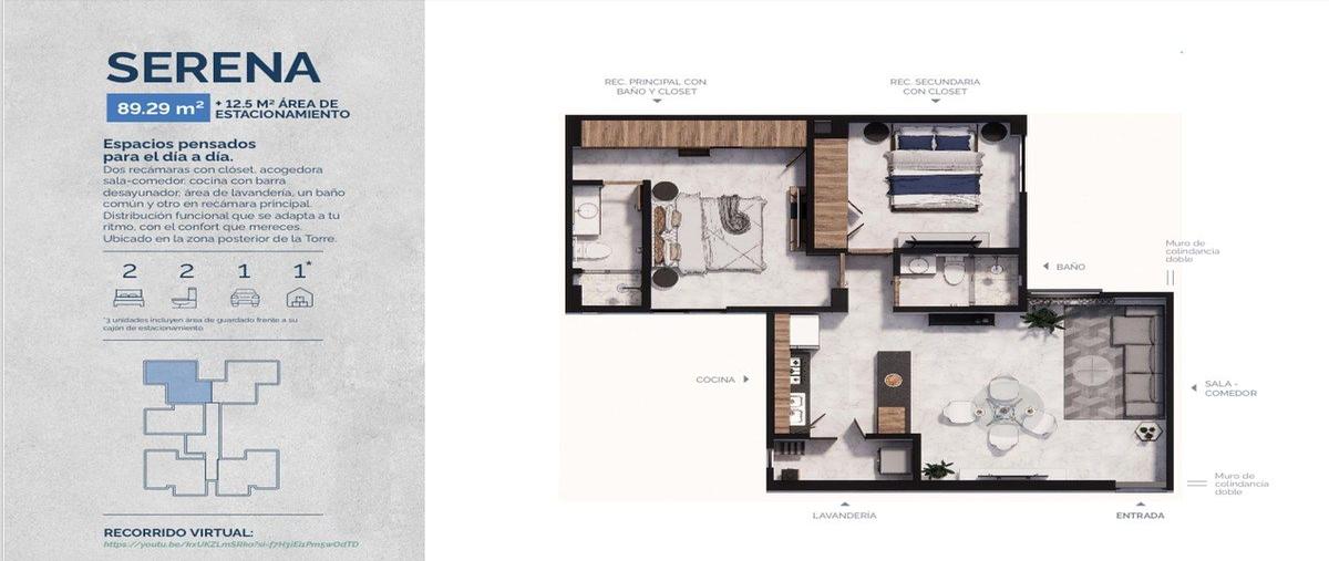 Serena 89 m + 12 m area de estacionamiento espacios pensados para el día a dia. dos recámaras con clóset. acogedora sala-comedor. cocina con barra desayunador, área de lavandería, un baño común y...