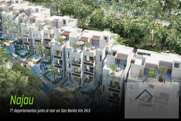 Najau consta de 8 edificios en la playa de 3 niveles más roof top cada uno, que alojará 72 departamentos de 2 o 3 recámaras y cuarto de servicio, con múltiples amenidades tales como terrazas, alberca...