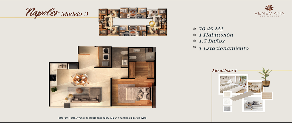 Para el modelo nápoles, mantendremos el estándar de veneciana residences. este nombre evoca una mezcla de tradición y vitalidad urbana; ideal para un departamento que equilibra perfectamente los metro...